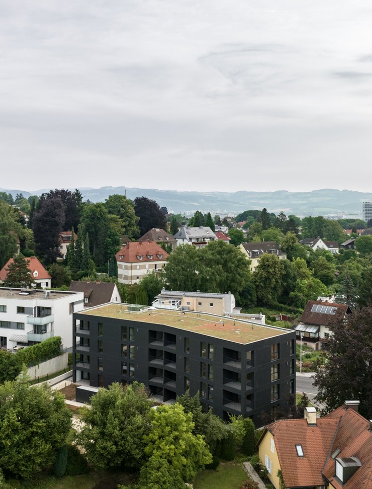 Der von der Straße aus als eleganter, dunkler, monolither Block erscheinende Bau wird mit umweltfreundlicher Fernwärme beheizt. Auf dem in leichter Hanglage gelegenen Grundstück wird darüber hinaus eine attraktive Gemeinschaftsfläche gärtnerisch ausgestaltet und mit Regenwasser-Management ausgestattet. In den Obergeschoßen kommt Ziegel als nachhaltiger Baustoff zum Einsatz. Eine Bushaltestelle befindet sich unmittelbar vor dem Wohngebäude.