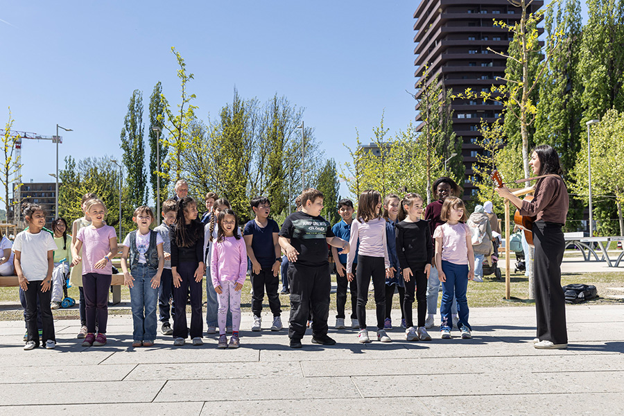 Die benachbarten Schulen lieferten das künstlerische Rahmenprogramm für die Ansprachen von Stadtbaudirektor Bertram Werle, ARE Geschäftsführer Gerald Beck und Vizebürgermeisterin Judith Schwentner. Die Ausstattung für Tischtennis, Schach und Boccia hat Gerald Beck an die Vizebürgermeisterin übergeben und sie wurde bei der anschließenden “Platzprobe” gleich von den Grazerinnen und Grazern getestet. Auch das Wasserspiel konnten die Kinder beim ersten Pritscheln einweihen.