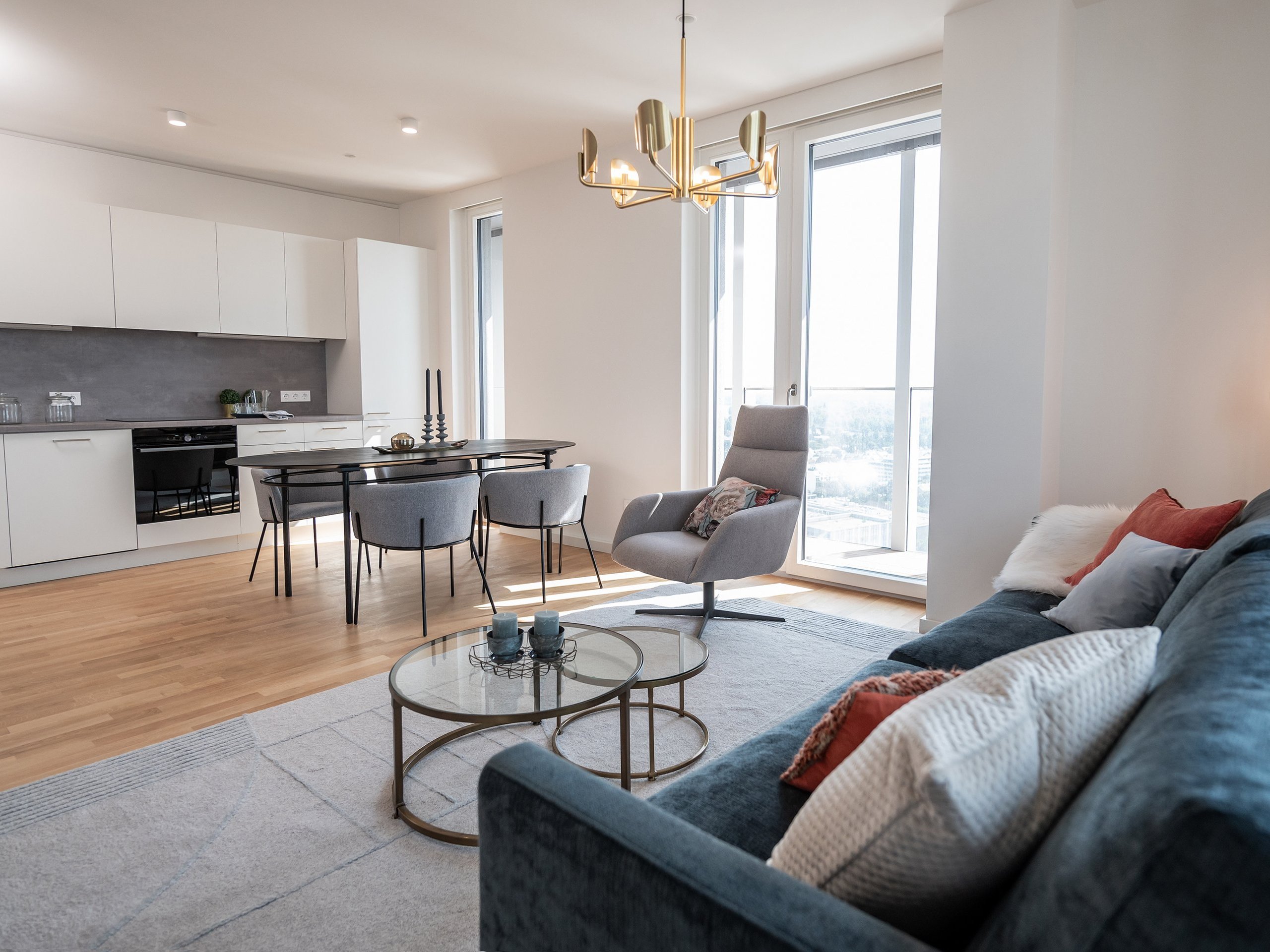 Ab dem 18. Obergeschoß des rund 155 Meter hohen Turms eröffnen sich den künftigen Bewohnerinnen und Bewohnern der Mietwohnungen beeindruckende Ausblicke über die Stadt. Die Wohneinheiten verfügen über 1,5 bis vier Zimmer und sind zwischen 38 und 125 Quadratmeter groß. Alle Wohnungen bieten private Loggien und sind bereits mit einer Küche ausgestattet. Für wohlige Wärme im Winter sorgt die Fußbodenheizung während im Sommer dank der Bauteilaktivierung kaltes Wasser durch die Decken fließt und die Räume sanft kühlt.