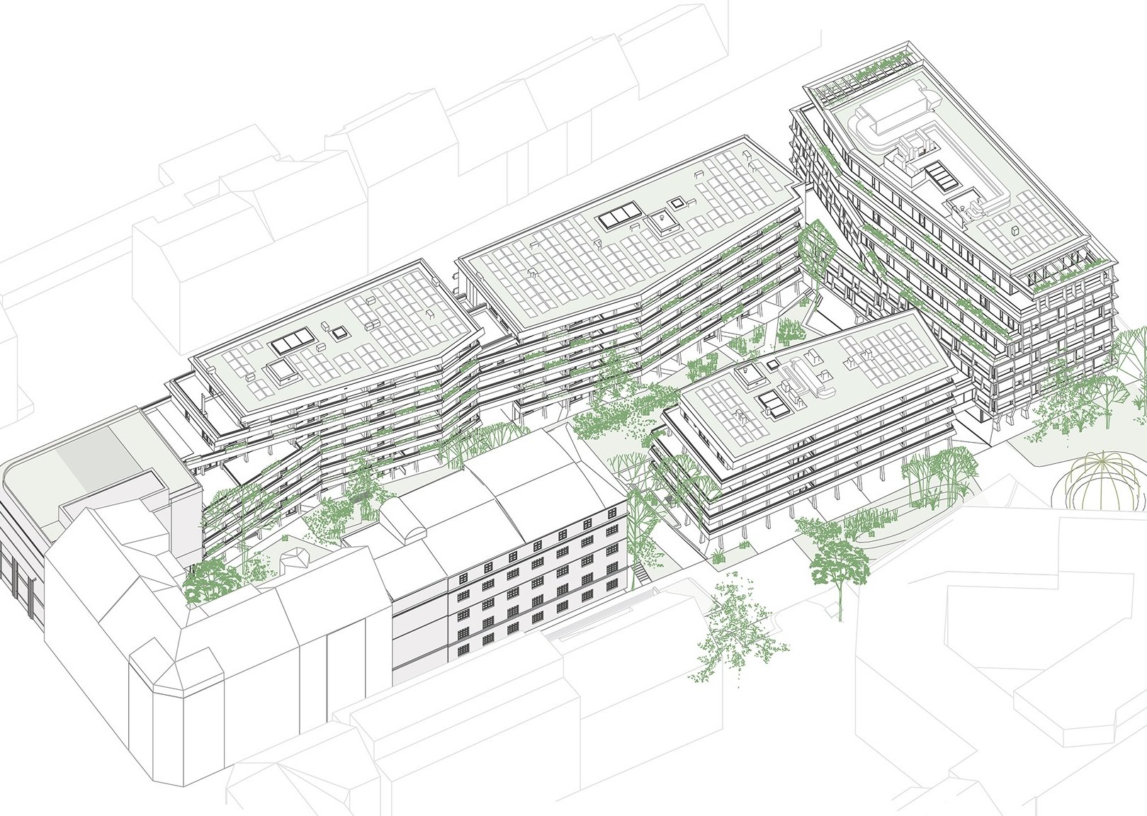 Die Außenräume folgen dem Prinzip der Schwammstadt: Entsiegelung, Begrünung, schattenspendende Bäume und Terrassengärten verbessern das Mikroklima und halten Regenwasser zurück. Umlaufende Veranden und integrierter Sonnenschutz reduzieren die Aufheizung der Fassaden und senken den Kühlbedarf.